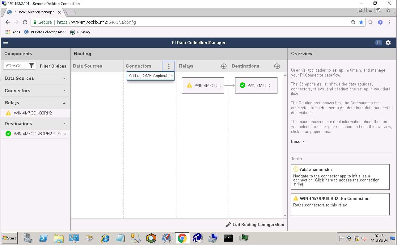 The PI Connector Relay has been discontinued by OSIsoft. All new deployments should use the PI Web API endpoint. Existing installations will still be supported. The PI Connector Relay was the original mechanism by which OMF data could be ingesting into a PI Server. To use the PI Connector Relay, open and sign into the PI Relay Data Connection Manager.