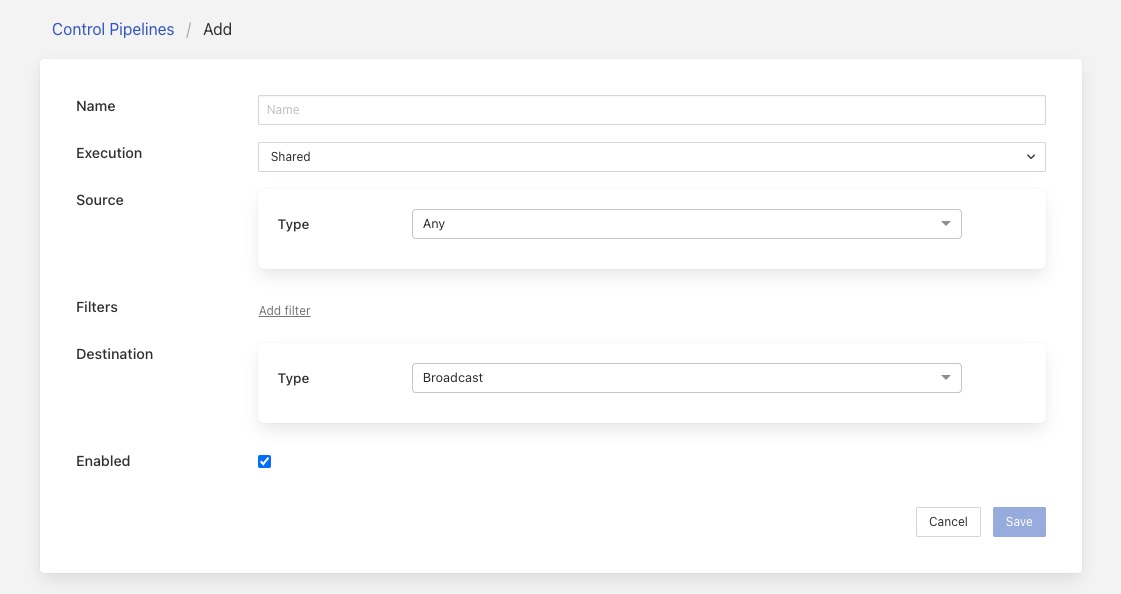 Control pipelines are always executed in the control dispatcher service. When a request comes into the service it will look for a pipeline to pass that request through. This process will look at the source of the request and the destination of the request. If a pipeline that has source and destination endpoints that are an exact match for the source and destination of the control request then the control request will be processed through that pipeline.