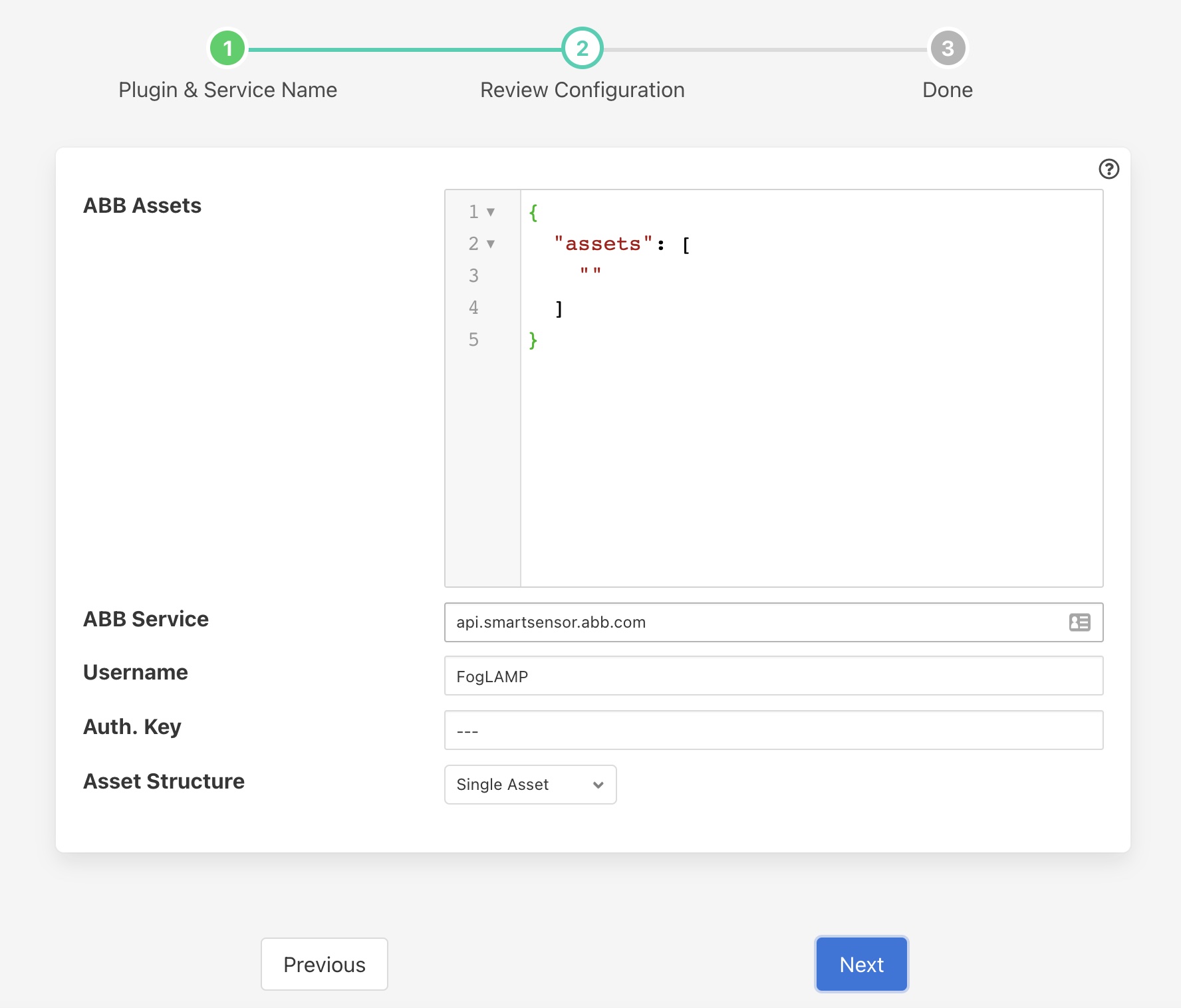 ABB Assets: A list of the assets in the ABB cloud service that should be read. This is a JSON document with an array called assets which contains the assets name as strings.